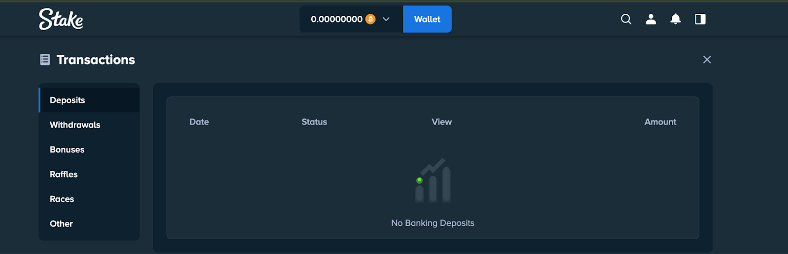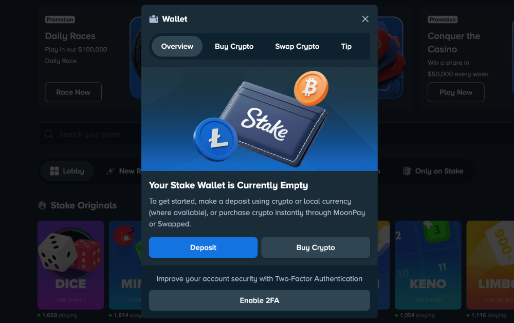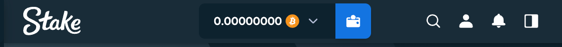 The wallet button is always at the top of the Stake page when you're logged in, whether you're on the homepage or playing a game. Upon clicking the wallet button, you'll be redirected to a window where you can make a deposit or withdraw funds.