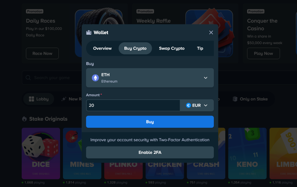 Stake has partnered with MoonPay as a supported third-party provider. You can buy crypto conveniently through their website.