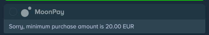 Stake MoonPay has a minimum limit that varies with the currency you wish to use for payment. In general, it is set to €20.00, and MoonPay won’t be available as an option unless you input an amount equal to or more than that. It will be greyed out with a note stating ‘Sorry, minimum purchase amount is 20.00 EUR’.
