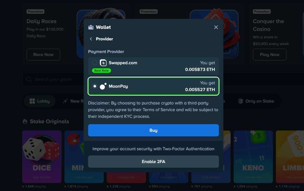 Stake Casino MoonPay: Secure third-party service for buying crypto