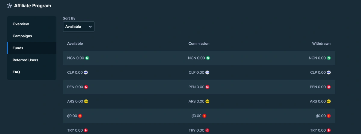 - Tap the ‘Funds’ tab in the menu at the corner. There, you can view your available commissions and those you've already withdrawn.